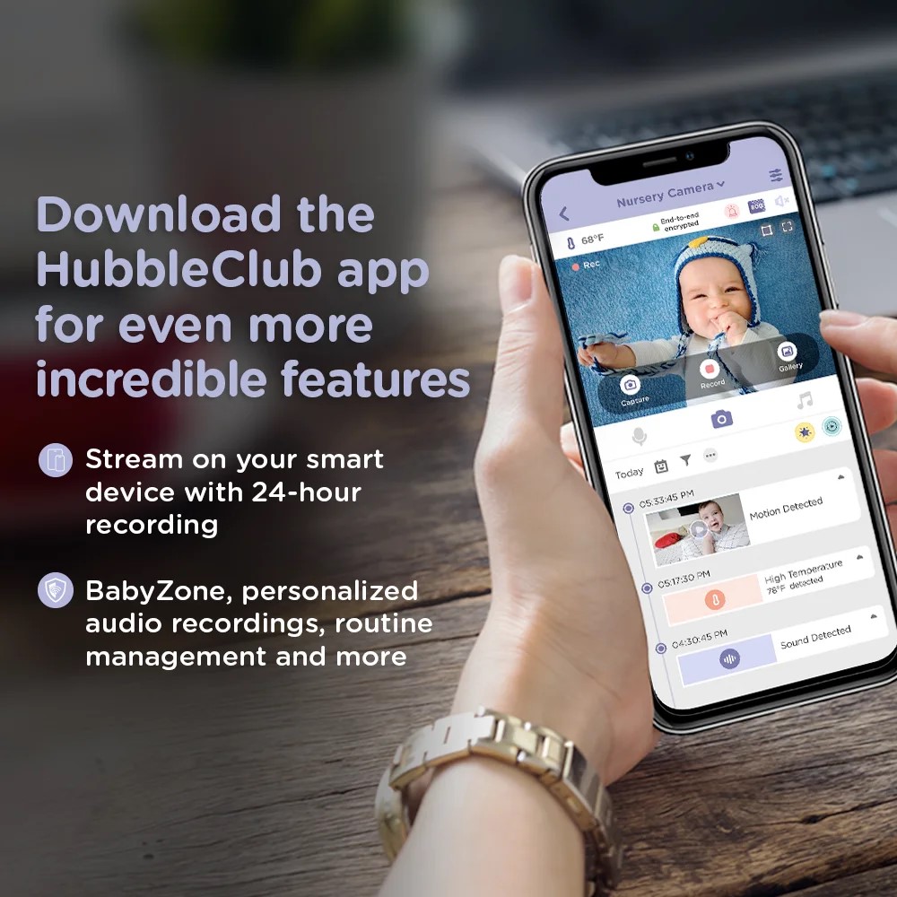 Command all these features and more with the comprehensive HubbleClub app. View from anywhere, access Video Recording and the Baby Growth & Development Tracker to capture special moments and log each meaningful milestone. Finally, make sure you stay connected anytime, anywhere by setting up sound and motion notifications on your smart device.